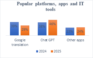Figure 3 showed it. ChatGPT and Google Translate were used more frequently than other tools and apps. According to the study, participants had used Google translation in 2024, it is decreased by 10% in 2025. Also, users of ChatGPT had increased by 8% in 2025, so students have preferred use it rather than Google translation. It presented that usage of ChatGPT was more popular among the young people. 23-24% of the students have chosen other AI tools such as ChatGPT, Google Translation, Bolor toli /Dictionary/, Deep L, Gengo, X Translate etc... Totally, all students had used IT technologies for translation. As a result, educators are now integrating these technologies into their curricula to better prepare students for a tech-driven world.