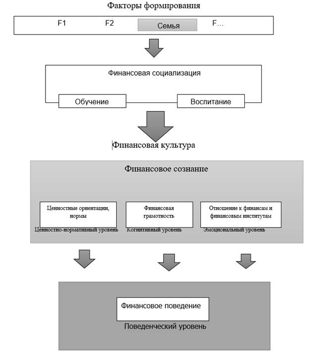Формирование финансовой культуры – целенаправленный и управляемый процесс, осуществляемый субъектом [родительской семьей] для передачи ценностей, норм поведения (ценностно-нормативный уровень), знаний (когнитивный отношения к финансам и финансовым институтам (эмоциональный уровень), позволяющий формировать определенный тип финансового поведения объекта [детей] на финансовом рынке (поведенческий уровень) (рис. 1).