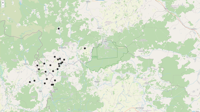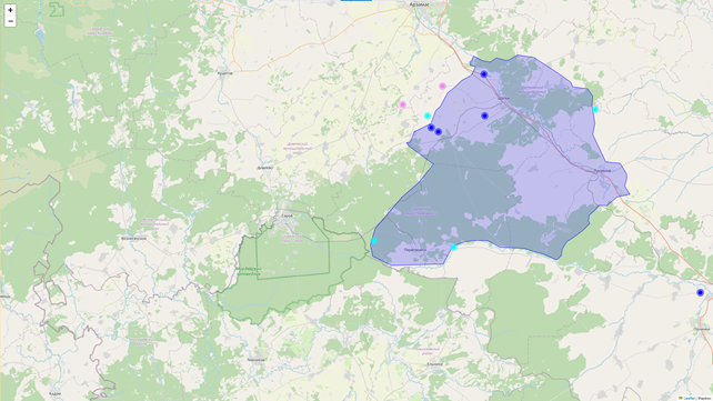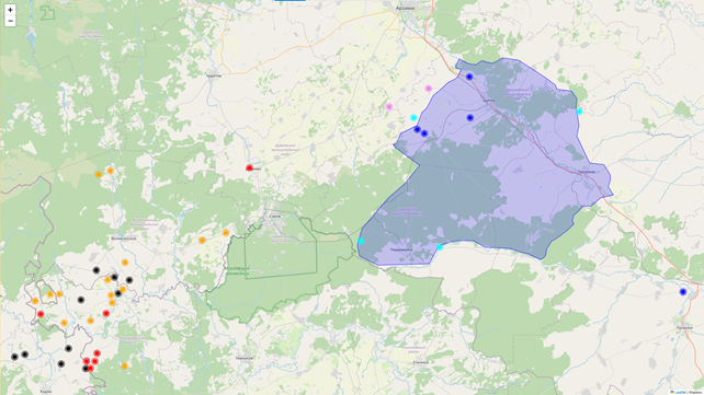 Разреженность, скорее всего, вызвана малым количеством документов с упоминанием населенных пунктов данного стана: за XV-XVIII вв. известно всего лишь 6 таких дел – скорее всего, это вызвано неоднократными пожарами в Приказе Казанского дворца. Для ряда деревень известна их принадлежность к белякам, а значит, если предположить, что беляки были административно-территориальными единицами и каждый беляк целиком находился внутри одного стана, то можно компенсировать нехватку информации о поселениях путем нанесения на карту всех беляков, чьи населенные пункты хотя бы раз упомянуты в Арзянском стане – эта задача не является сложной, т.к. в писцовых и переписных книгах XVII века указано, к какому беляку относилась та или иная деревня. На Рисунке 3 обозначены: оранжевым цветом – Чепчерский беляк, красным цветом – Ерехтинский беляк.