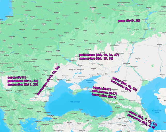 На Рисунке 1 представлено географическое обобщение всех сведений древнегреческих и древнеримских авторов о местоположении аорсов, из которого видно, что разные авторы помещают аорсов, роксоланов, массагетов и амаксобиев в одни и те же области, что подтверждает нашу гипотезу о равнозначности данных этнонимов. По имеющимся данным, в Античное время можно выделить 7 групп аорсов: манычскую (первое упоминание – VIII в. до н.э.), куро-аракскую (VII в. до н.э.), донскую (I в.), кубанскую (I в.), окско-волжскую (II в.), тисо-дунайскую (I в.) и прутско-дунайскую (II в.), причем, как будет показано далее, первые 5 продолжат свое существование и в Раннем Средневековье, а некоторые из них – вплоть до прихода монголов.