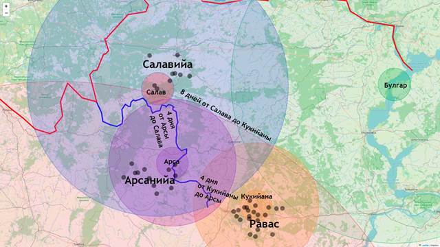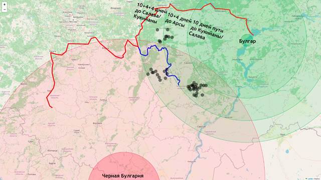 В середине и конце X века аль-Истахри и ибн Хаукаль сообщали, что на реке Итиле живут булгары (белые), русы, булгары (черные), буртасы и хазары. Еще они рассказывали о 3 областях русов: самая северная – Славийа со столицей в Славе, Арсанийа со столицей в городе Арсе, и еще одна, крупнейшая и безымянная, область со столицей в городе Куйабе, который больше города Булгара [8, с. 94]. Единственный ориентир, который они дают, это расстояние от страны булгар до Куйабы – 20 дней, причем они не сообщают о какой именно Булгарии речь: о Черной (Донской) Булгарии, или же о Белой (Волжской) Булгарии. Ввиду того, что рядом они писали, что от этой Булгарии до Рума (Восточной Римской империи) 10 дней, а до внутренних башджиртов – 25 дней, становится ясно, что речь о Черной Булгарии, которая была близка к владениям Византии (Рима) в Крыму, но находилась далеко от башкиров. Очевидно, что одного ориентира недостаточно для локализации этой группы русов, но благодаря привязке к Итилю, можно предположить, что речь идет о окско-волжской группе аорсов. На Рисунке 4 см. №7.