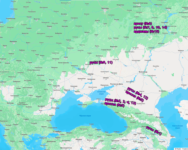 В середине X века хазарский царь Иосиф писал, что на реке Итиле живут народы, платящие дань хазарам: бур-т-с, бул-г-р, с-вар, арису, ц-р-мис, в-н-н-тит, с-в-р и с-л-виюн [10, с. 98]. Народ «арису» мы отождествляем с аорсами. На Рисунке 4 см. №6.