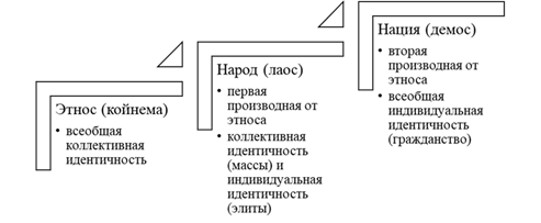 Всеобщая индивидуальная идентичность, которая указана итоговой и основной характеристикой нации в схеме (рис. 1.1.), выражается в гражданстве и, приняв такую схему, мы можем предположить достижение идеальной формы социального устройства – гражданской нации. Однако, фактор этничности сохраняется и дает о себе знать в конкретных социально-политических ситуациях.
