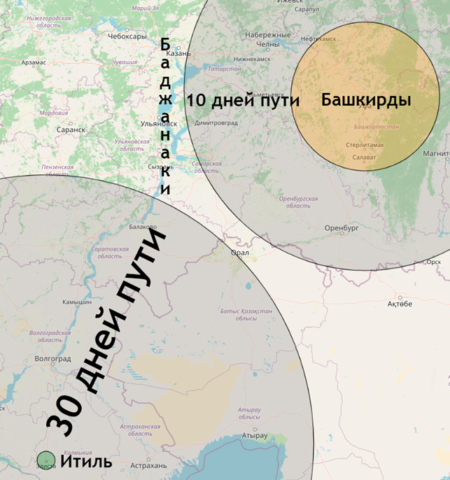 Аль-Балхи, аль-Истахри и ибн-Хаукаль (X в.) писали, что баджанаки являются шипом/острием и силой русиев (аорсов), а также, что тюркским баджнакам не хватало земли, из-за чего от них отделилась группа, которая завоевала земли между Румом (Византия в Крыму) и Хазарией, и поселилась на них [5, с. 82, 89, 90]. Сведения о баджанаках как бы вплетены в информацию о русах (аорсах), но поскольку аорсы это саки, то для арабов аорсы – тюрки, а аорсские баджанаки – тюркские баджанаки, из чего можно предположить, что данная группа баджанаков находилась в зависимости от аорсов. Еще они сообщали, что от внутренних баджнаков до буртасов – 10 дней пути, до города Итиля – месяц пути, а до башкирдов – 10 дней. Город Итиль находился где-то в округе Элисты, а под башкирдами, как правило, понимали либо башкир, либо мадьяр – мы считаем, что в данном случае более вероятен первый вариант. Локализация буртасов очень ненадежна, т.к. в этом этнониме смешивали булгарское племя бараджаров и финно-угорских мердасов-мардов, а потому данный ориентир мы не стали использовать. Результат локализации земли баджанаков по двум надежным ориентирам представлен на Рисунке 2.