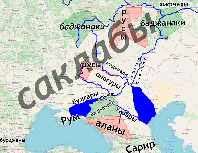 Анонимный автор «Худуд аль-Алам» (X в.) рассказывал о трех группах баджанаков: явно – о тюркских баджанаках и хазарских баджанаках, а неявно – об условных окских баджанаках [28, с. 101, 160]. Для тюркских баджанаков он приводил следующие ориентиры: к Северу – река Руса (Раса/Рангха, т.е. Волга), к Югу – буртасы и барадасы, к Западу – русы (аорсы) и маджары, к Востоку – гузы. При описании русов он упоминал, что к Востоку от них находятся горы баджанков (не указано каких) – мы считаем, что речь о Жигулевских горах. При описании буртасов (левый берег Итиля) и барадасов (правый берег) он писал, что к Северу от них находятся баджанаки, т.е последние занимают оба берега Итиля. При описании хифчаков он повествовал, что к Югу от них находятся баджанаки (какие – не указано), а со всех остальных сторон расположены северные безлюдные местности – мы считаем, что здесь хифчаками названы не кыпчаки/куманы, как могло бы показаться сперва, а праудмурты, которые, вероятно, тогда имели общий этноним с народом коми: «камы/камиос», т.е. «камцы, народ с реки Камы», созвучный с этнонимом куманов (кыпчаков). При описании реки Итиля автор рассказывал, что она отделяет баджанаков от буртасов – важно учесть, что арабским географам свойственно смешивать мердасов-мардов, которые были населением страны аорсов (правый берег Итиля), с бараджарами-булгарами (левый берег): здесь, судя по всему, под буртасами подразумеваются бараджары – правящее племя Булгарии. При описании реки Русы (Волги) он говорил, что она впадает в Итиль (Каму) в землях баджанаков, что совпадает с регионом распространения именьковской культуры. Для хазарских баджанаков автор приводит следующие ориентиры: к Северу – мирваты, к Югу – аланы, к Западу – море Гурз (Черное и его залив – Азов), к Востоку – хазарская гора. Про них он сообщал, что эти баджанаки являются переселенцами, которые отделились от тюркских баджанаков и завоевали эту страну – вероятно, это объясняет существование между Кубанью и Доном Тмутараканского удельного княжества в составе Черниговского княжества, традиционно связываемого с вятичами. При описании аланов автор говорил, что к Северу от них живут баджанаки. При описании мирватов он писал, что к Югу от них находятся баджанаки. При описании моря Гурз он упоминал баджанаков как самое восточное племя на северном побережье. При описании гор он рассказывал про гору, идущую из земель хазар к землям внутренних булгар (приазовских) и русов (донских аорсов) через земли баджанаков. Далее мы хотим описать, что именно натолкнуло нас на мысль о существовании третьей группы баджанаков: при описании реки Руты (Дона-Донца) анонимный географ информировал о том, что она расположена к Югу от русов (окско-сурских аорсов) и что ее исток находится между баджанаками (какими – не указано), маджгарами и русами (какими – не указано), а далее она течет через земли русов (донских аорсов), после чего попадает в земли саклабов у города Хурдаба. В главе о русах автор сообщал, что среди них живут саклабы, которые им служат, т.е. расположение Хурдаба в землях донских аорсов не вызывает вопросов. Про Хурдаб автор рассказал, что он находится к Северу от горы (Донецкого кряжа), отделяющей внутренних булгар (приазовских) от русов (донских аорсов), т.е. Хурдаб расположен в степной области и стоит где-то на Доне-Донце. Но «тюркские бад