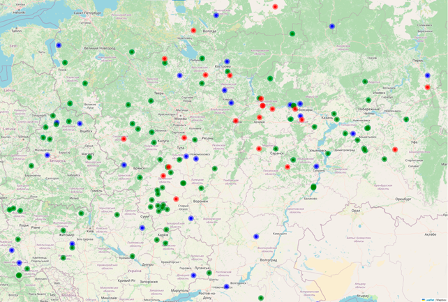 На Рисунке 4 отображены этнотопонимы с производными от корней -черемис- (красные круги), -черемуш- (зеленые круги) и -черемух- (синие круги) – видно, что они особенно часто встречаются в Среднем Поволжье и в северо-восточных землях племени северян. Может показаться, что корни -черемуш-/-черемух- связаны с черемшой и черемухой, но в других регионах, где встречаются эти растения, такие топонимы редки, а значит они, скорее всего, отражают переосмысленный черемисский этноним.