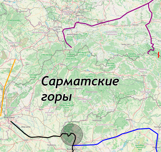 На Рисунке 1 обозначен Сарматский рубеж (синее), Висла/Вислока (фиолетовое), город Карпис и изгиб Дуная (черное), Нижнеморавская низменность (оранжевое) и перевал Дукля (красное).