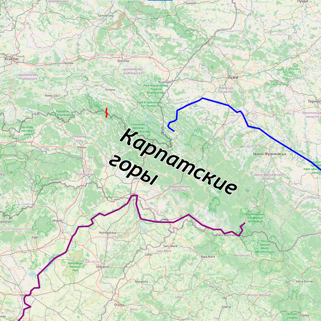 На Рисунке 2 обозначены перевал Дукля (красное), река Днестр (синее) и река Тиса (фиолетовое).