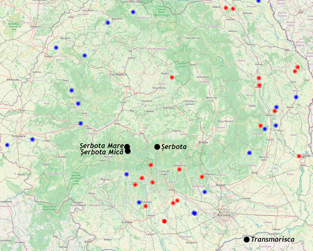 На Рисунке 4 красными точками обозначены топонимы с корнем -șerb-, а синими точками – топонимы с корнем -sărb-, отражающим современное румынское название сербов (Sârbi).