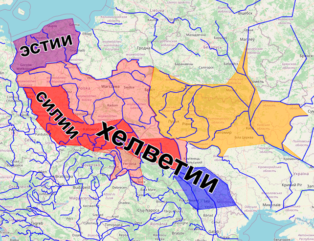 Все 3 группы соседствуют только в одном регионе: около Фессалии, где некогда существовала Великая Влахия – вместе они образуют там область с уровнем разнообразия 5/5. Также, обращают на себя внимание высокие уровни разнообразия в районе Фракии, где римскими императорами были поселены волохи, в районе Восточных Карпат, где известны Бастарнские горы [20, с. 18], в районе Галиции, где мы локализуем хелветиев, и в районе Нижней Вислы, где античные авторы помещали эстиев.
