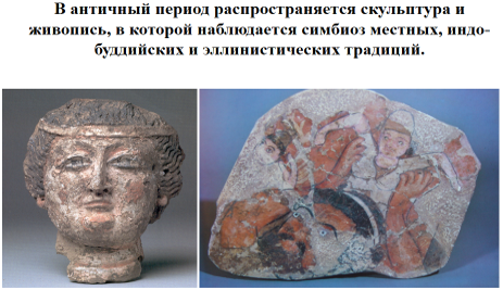 Как свидетельствуют археологические находки, культура в период Греко-бактрийского царства переживает подъем вследствие соединения и смешения нескольких культур. Были найдены скульптуры, живопись, монеты, резные и ювелирные изделия, которые свидетельствовали о расцвете культуры и ремесел в этот период [8, C. 41].