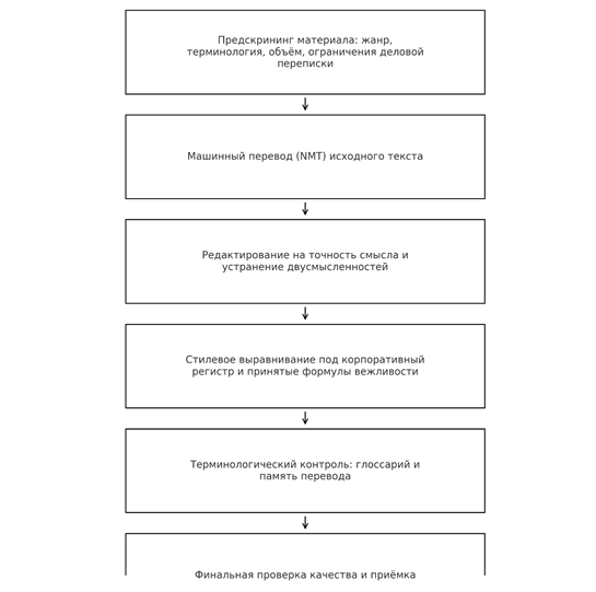 Критическая часть контура качества — постредактирование машинного перевода по ISO 18587 с чётким разделением этапов. Схема процесса представлена на рисунке 1; включение этого цикла в операционные регламенты отделов международного развития стабилизирует тон, соблюдение речевой вежливости и деловой этикет в переписке и презентационных материалах. В среде высоких темпов лидогенерации такой регламент снимает часть рисков и разгружает нативных редакторов, перенаправляя их на узкие случаи и отраслевые термины [6; 3].