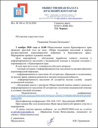 Рисунок 2. Приглашение на круглый стол на тему: «Меры поддержки населения в период коронавирусной инфекции в Красноярском крае» за подписью Н.В. Грушевской. 29.10.2020 г.