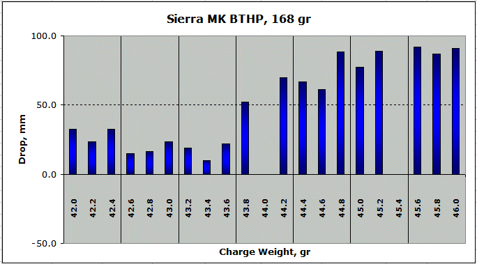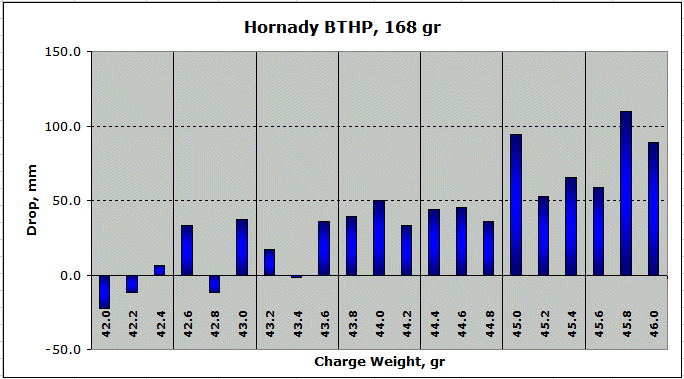 1. "Одинаковые" пули от разных производителей дают неодинаковые "сладкие точки". Из Хорнади, по всей видимости, можно выжать почти такие-же результаты, что и из Сиерры. Но Хорнади надо отбирать.