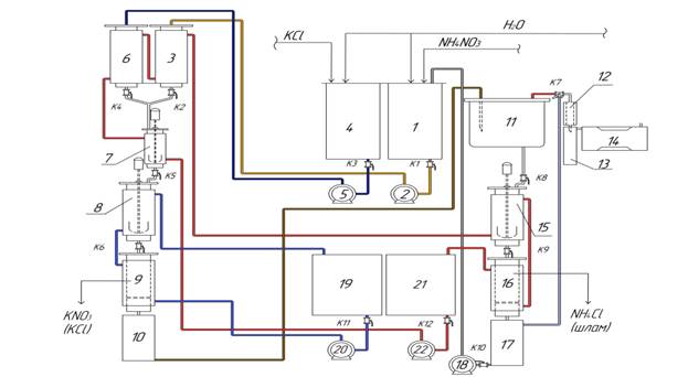 1-растворител NH4NO3; 2,5,18,20,21-водяной насос поверхностный; 3-напорный бак NH4NO3; 4-растворитель KCl; 6-напорный бак KCl; 6- растворитель KCl; 7- Реактор конверсионного по перемещающий; 8,14- Реактор кристаллизатор по перемещающий; 9,15- Фильтр, 10; 14- Барометрический ёмкость; 11- Испаритель; 12-конденсатор; 13-вакуумный насос; 16- Охладитель; 19- Теплоноситель; к1, к2, к3……к9,к12-кран.