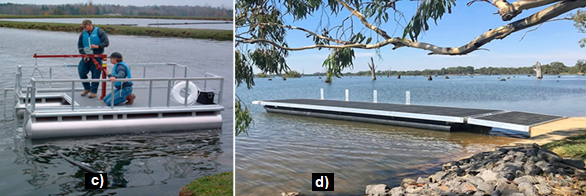 Figure 1. Pontoons: a) structure of a simple pontoon; b) cargo pontoon; c) floating pump platform; d) coastal platform