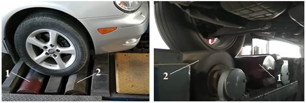 The operating principle of the proposed Panton drive mechanism using a car transmission also resembles the reverse operating principle of the vibration diagnostics device used in car suspension (Fig. 6). In the diagnostic device, roller 1 is driven into rotation by means of an electric transmission to rotate the car wheel, while vibrations are created in the wheel with a non-cylindrical surface of roller 2, which rotates due to the compressive force of the wheel, which ensures the measurement of the technical condition of the wheel suspension during vibrations using sensors [14].