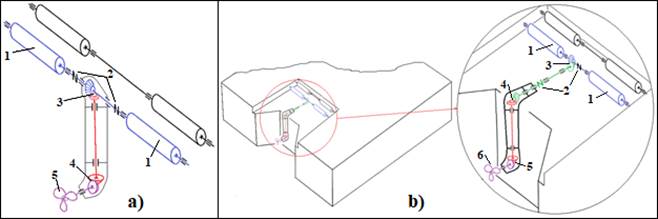 Figure 7. Kinematic diagrams of mechanisms moving pontoons using a motor vehicle drive; a) two-stage; b) three-stage