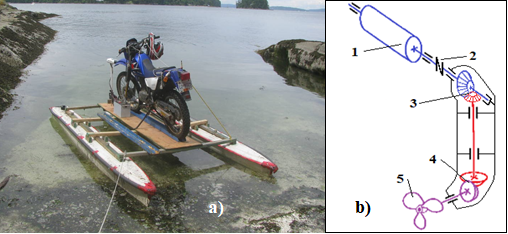 In a simple two-stage drive mechanism, the rotational motion is received from the vehicle wheel and transmitted to the first conical stage 3, then to the second conical stage 4 thanks to its cylindrical roller 1 and clutch 2, as a result of which the pontoon drive propeller 5 rotates (Fig. 7, a). "In these mechanisms, the conical gears are positioned at a 90-degree angle, as in engines designed for water transport, and the motion is transmitted in reverse. In general, the mechanism is rigidly fixed from the body to the platform, and the rotation of the pontoon can be achieved through an additional keel-steering mechanism (this may be in two-stage mechanisms shown in Figure 7a and Figure 8b) or a compensating coupling capable of operating at an angle (This may be in the mechanism shown in Figure 7b)".
