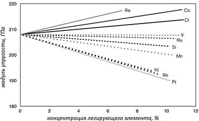Влияние растворенных легирующих элементов, таких как рений, кобальт, хром, иридий, рутений, кремний, марганец, никель, родий и платина, на модуль упругости стали проиллюстрировано на рисунке 1 [7]. Небольшое увеличение модуля упругости наблюдается при повышении содержания рения, кобальта или хрома.