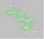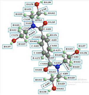 Следующим этапом вычисления стало определение зарядных значений атомов составляющих молекул. С помощью программы «Hyper Chem» методами AM1 и PM3 были вычислены и определены зарядные значения атомов (рисунок 3) и 2D изображение электростатического потенциала.