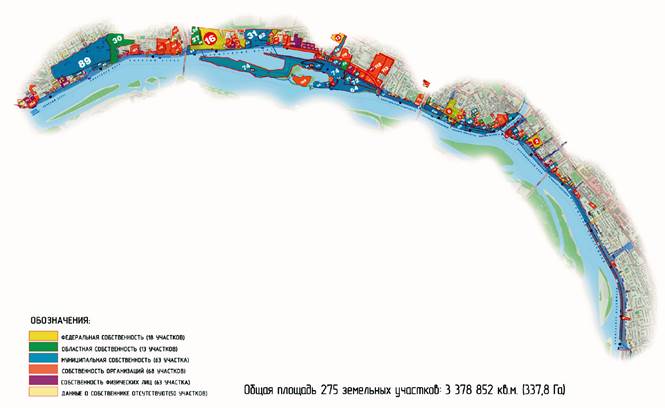 1. Инвентаризация прибрежных участков. Как и в исследовании Темзы, следуя примеру Саваренской, в процессе выполнения настоящей работы было проведено аналогичное исследование прибрежных территорий Иртыша в Омске. На участке правого (восточного) берега протяженностью 15 км (от Северного причала до Южного порта) были изучены 275 земельных участков, находящихся в федеральной, областной, муниципальной и частной собственности. Общая площадь всех участков от уреза реки до центральной магистральной улицы составила 337 гектаров, из которых: