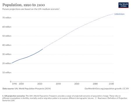В докладе ООН «Перспективы мирового населения до 2024 года» [10] утверждается, что население Узбекистана демонстрирует постоянную тенденцию к росту, начиная с 1990 года. С примерно 20 миллионов в 1990 году до 36 миллионов в 2024 году население выросло. Согласно будущим оценкам, численность населения будет постепенно увеличиваться и к 2100 году достигнет около 72 миллионов человек (рис. 1).