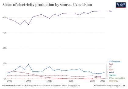 Рисунок 3. Доля производства электроэнергии по источникам, Узбекистан из [12]