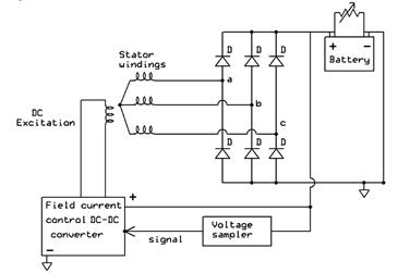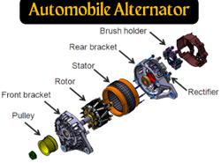 Электрическая энергия подается на автомобили через генератор переменного тока. Он состоит из статора, шести диодов, регулятора и ротора, который установлен на двух концевых подшипниках рамы машины. В автомобильном генераторе используется трехфазный синхронный генератор с намотанным полем.