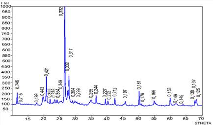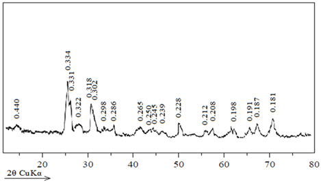 Рентгеннограмма бентонитовых глин (рис. 3-4) показаны дифракционными максимумами: кварц (d=0,421; 0,332; 0,244; 0,227; 0,222; 0,212; 0,197; 0,181; 0,166; 0,153; 0,145; 0,138; 0,137 нм), мусковит (d=0,499; 0,443; 0,399; 0,376; 0,364; 0,322; 0,299; 0,255, нм), албит (d=0,364; 0,317; 0,294; 0,150 нм), монтмориллонит (d=0,750; 0,500; 0,448; 0,304; 0,255; 0,244), хлорит –(d=0,715; 0,443; 0,349 нм) было установлено, что дифракционные максимумы, принадлежат к указанным минералам. Следовательно, по своему химико-минералогическому составу глины Учсайского месторождения относятся к классу гидрослюдо-монтмориллонитовых глин, так как близки по составу ранее изученной глины Кушканатауского месторождения.