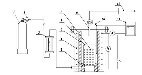 1) баллон с аргоном; 2) регулятор давления; 3) расходомер; 4) электрообогреватель; 5) реактор; 6) арматурный стержень; 7) реакционная сетка с нержавейкой; 8) сырье; 9) газопроводная труба; 10) термопара; 11) агрегат КС-2; 12) газоанализатор