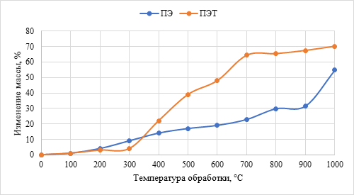 На рис. 2 приводится график зависимости изменения массы при термической обработке полимеров в течение 2 ч. График иллюстрирует изменения массы полиэтилена (ПЭ) и полиэтилентерефталата (ПЭТ) в зависимости от температуры в инертной атмосфере. Анализ данных показывает, что при температурах ниже 300°C масса изменяется незначительно (до 10%), что связано с испарением остаточных низкомолекулярных соединений и разложением нестабильных компонентов. В интервале 300-500°C наблюдается постепенное увеличение потерь массы, обусловленное разрушением углерод-углеродных связей в молекулярной структуре полиэтилена. В диапазоне 700-1000°C потери массы становятся максимальными, достигая 54,7% при 1000°C, а остаточная масса составляет 45,3%, что связано с образованием углеродного остатка.