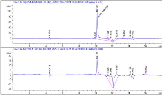 The high-performance liquid chromatography (HPLC) analysis of ellagic acid was performed at wavelengths of 254.4 nm and 276.4 nm, using an isocratic eluent flow. According to the analysis results, the retention time of ellagic acid in the column was found to be between 10 and 11 minutes. The chromatogram obtained during the analysis is shown in Figure 3.
