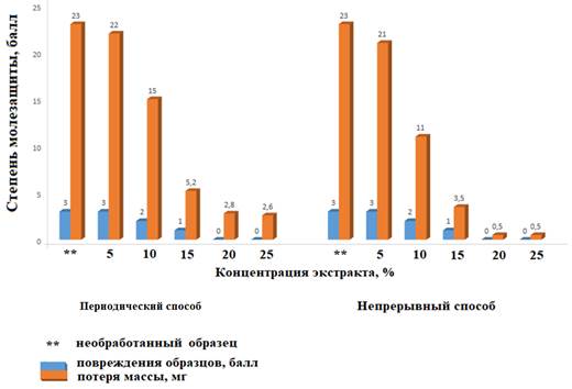 В отличие от способов и препаратов, описанных ранее, в данном исследовании молезащитная отделка проводилась совмещенным способом одновременно с окрашиванием шерсти натуральным красителем. Благодаря применению совмещенной технологии крашения натуральным красителем и молезащитной отделки были достигнуты положительные результаты в плане прочности окраски и молезащитных свойств при использовании эфирного лавандового масла Lamiáceae, содержащего ряд трудноразлагаемых, органических и ароматических соединений. После выделения экстракта Лаванды - Lamiáceae на установке "SOX406" из него были приготовлены водные растворы различной концентрации. В соответствии с ГОСТом 9.055-75 оценивали свойства шерстяных волокон по потере веса и повреждению образцов в зависимости от концентрации водного экстракта лаванды. Обработка водным экстрактом лаванды проводилась периодическим и непрерывным методами. Результаты эксперимента приведены на рисунке 1.