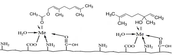 В связи с тем, что превышение концентрации экстракта более 20% практически не повлияло на молезащитные свойства волокон, для дальнейших исследований была принята 20%-ная концентрация водного раствора экстракта Лаванды. Непрерывный метод совмещенного крашения и отделки шерстяных волокон дал несколько лучшие результаты, чем периодический метод поскольку в непрерывном способе присутствует операция запаривания, в результате которой и происходит связывание аминогрупп кератина шерсти с группами Линалоол-C10H18O, Линалил ацетат - C12H20O2 экстракта Лаванды, что приводит к соединению и сшиванию двух полипептидных цепей и как следствие к повышению молезащитных свойств, так как Линалоол и Линалил могут оказывать антибактериальное и антиоксидантное действие за счет образования биологически активных соединений с шерстяным волокном (рис. 2).