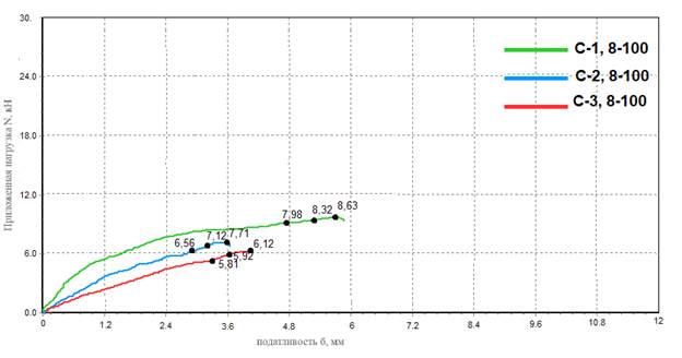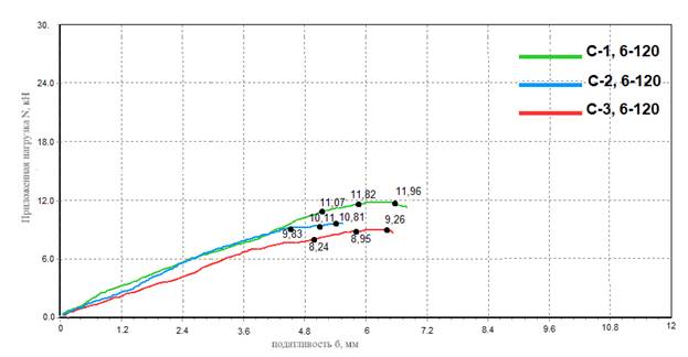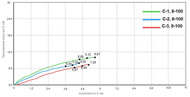 При испытании на выдергивание шурупа из древесины под углом 90о представленных на рисунках 3 и 4, показана зависимость податливости δ мм от нагрузки N, кН.