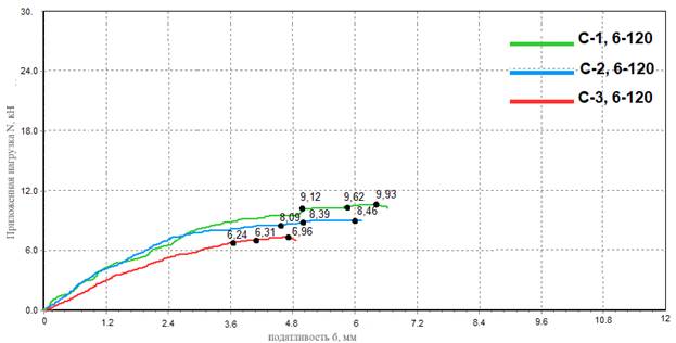 Рисунок 4. График зависимости нагрузки Р (кН) от деформации δ (мм) при испытании на выдергивание шурупа диаметром 6-120 мм из деревянного массива под углом наклона 90о