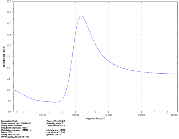 Ширина линии (Line width): Ширина линии (7.86 mT) показывает влияние магнитных дипольно-дипольных взаимодействий и кристаллической структуры, влияющих на магнитную структуру фталоцианина меди, модифицированного сульфогруппой. Это может указывать на высокую степень магнитной анизотропии.