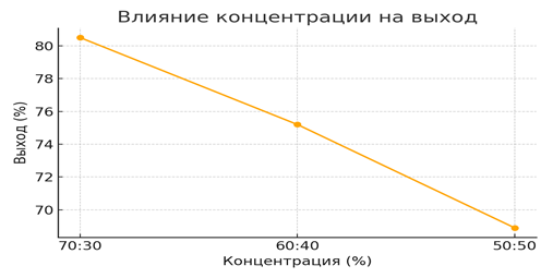 График демонстрирует зависимость выхода продукта от концентрации реагентов. Ниже приводится подробный анализ: выход продукта постепенно снижается с уменьшением концентрации смеси. Это указывает на то, что более высокая концентрация (например, 70:30) способствует большей эффективности реакции. Максимальный выход (около 80 %) достигается при соотношении концентрации реагентов 70:30. Это подтверждает, что более высокая доля одного из компонентов благоприятствует синтезу. При снижении концентрации до 60:40 и 50:50 наблюдается снижение выхода продукта до 75 % и 68 % соответственно. Уменьшение концентрации приводит к снижению эффективности реакции, так как молекулы сталкиваются реже, а побочные процессы могут усиливаться. Для достижения максимального выхода целесообразно поддерживать соотношение реагентов на уровне 70:30. Это позволит оптимизировать процесс с точки зрения сырьевых затрат и времени реакции.