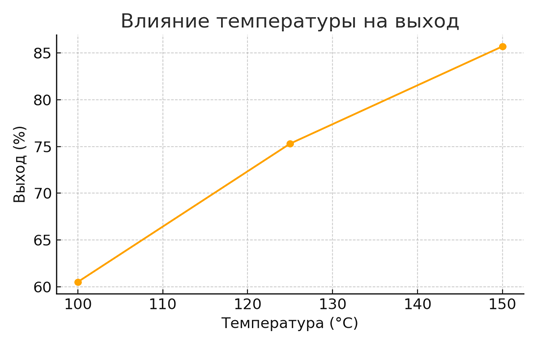 Высокотемпературная зона (150 °C): максимальный выход (около 85 %) достигается при температуре 150 °C. Это оптимальная температура для данной реакции, при которой обеспечивается максимальное количество эффективных столкновений молекул.