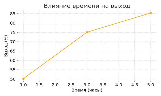 Оптимальный этап (5 часов): максимальный выход (около 85 %) достигается через 5 часов. Это указывает на завершение основного этапа реакции, когда большая часть реагентов превращается в целевой продукт.