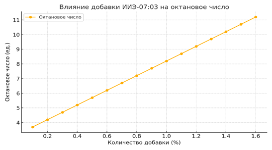 График демонстрирует влияние добавки ИИЭ-07:03 на октановое число бензина. Приведённый анализ показывает положительную корреляцию между количеством добавки и увеличением октанового числа.