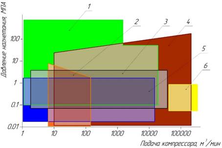 1 – поршневые компрессоры; 2 – воздуходувки; 3 – винтовые компрессоры; 4 – центробежные компрессоры; 5 – пластинчатые компрессоры; 6 – осевые турбо компрессоры