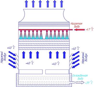 Охлаждение в градирнях происходит главным образом за счёт испарения оборотной воды, стекающей по оросителю в виде капель или плёнок под действием собственной силы тяжести (за счет испарения 1% оборотной воды понижается её температура примерно на 6°C) [3].