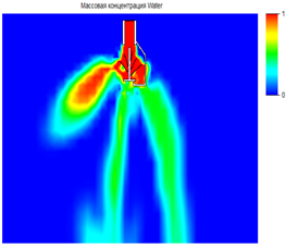 Из массовых концентраций видно, что наиболее эффективное взаимодействие воды и воздуха происходило в предложенной нами водоразбрызгиваемой форсунке (рис. 5 а). Мы знаем, что чем меньше скорость движения капель воды, тем эффективнее происходит взаимодействие между каплями и воздухом. Результаты расчетов по скорости в программе SolidWorks Flow Simulation показали, что предложенная нами водоразбрызгиваемая форсунка (рис. 5 б) уменьшила скорость движения капель и увеличила взаимодействие с воздухом за счет того, что она препятствует движению воды. Результат расчетов по температурам в программе SolidWorksFlowSimulation на рисунке 5в показал, что температура воды предложенной нами водораспылительной форсунки позволяет снизить температуру воды до +33,5 0С. Мы можем увидеть, насколько эффективно мы получили эту низкую температуру на рисунке выше показано с помощью заливки температуры текучая среда и линия потока. На рисунке 5с мы можем видеть, что предлагаемая нами форсунка имеет более высокий угол раскрытия факела и может обеспечивать равномерное распределение воды по площади орошения.