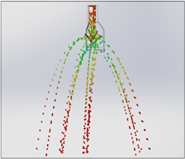Результаты и обсуждения: Результат расчетов, выполненных в программе SolidWorks Flow Simulation, показал, что предлагаемое нами водоразбрызгивающая форсунка обладает лучшими показателями по распылению жидкости, а разбитые капли воды хорошо увеличивают взаимодействие с воздухом. Мы можем видеть это на рисунке 5.