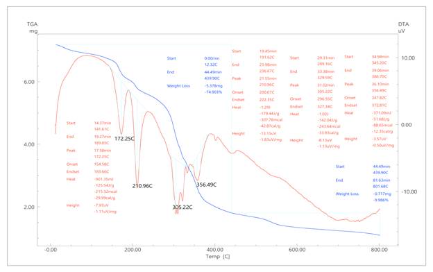 Синтезируется в сухой массе, представленной на рисунке 1. Для ингибитора коррозии марки ЭДФ-1 была выбрана максимальная температура 800°C. результаты анализа ингибитора коррозии были представлены на дифференциальный термогравиметрический (DTA) термогравиметрическая дериватограмма (TGA) и исследованы на основе анализа. Было обнаружено четыре эндотермических пика при температурах 172,25°C, 210,96°C, 305,22°C и 356,49°C, которые являются пиками на кривой термического анализа, представляющими процесс поглощения тепла. В эндотермических процессах материал поглощает тепло из внешнего источника, и это изменяет его внутреннее энергетическое состояние. Мы можем увидеть изменение энергетического состояния в таблице 1.