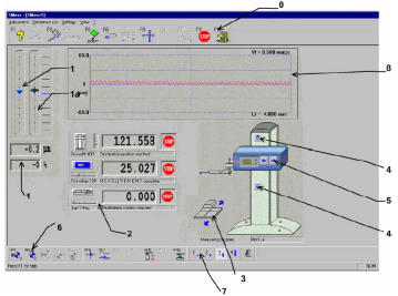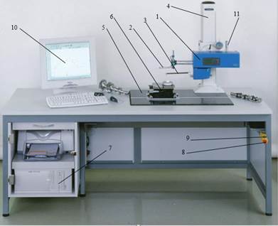 Profilograph-profilometer is one of the most universal contact tools for measuring surface roughness parameters. Device linear sliding device 1, Thunder-measuring head 2 for measuring accuracy, measuring head 3 for measuring profile, measuring Column 4, granite table 5 insulated from vibration, measuring Table 6, processing and Control Unit 7, emergency lock button 8 and device launch 9, software shown on Monitor 10, a device for microvint adjustment of the deviation of the measuring probe Action Line.
