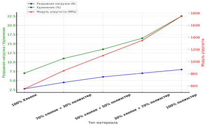 На основании графика и таблицы можно сделать вывод, что прочность хлопково-полиэстерной смеси увеличивается по сравнению с чистым хлопковым волокном. Это объясняется высокой прочностью полиэстера, которая оказывает значительное влияние на комплексные нити. Эластичность полиэстера способствует увеличению удлинения при разрыве (elongation at break) комплексных нитей. Хлопково-полиэстерные смеси обладают большей устойчивостью к растяжению по сравнению с чистыми хлопковыми волокнами. По мере увеличения доли полиэстера в комплексных нитях также возрастает модуль упругости, что свидетельствует об увеличении жесткости материала.