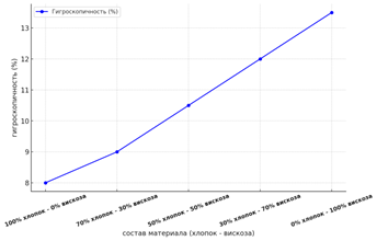 Таким образом, в зависимости от области применения конечного продукта, можно регулировать содержание вискозы на основе графических данных. Например, для повседневной одежды оптимальный баланс гигроскопичности достигается при соотношении 50% хлопка и 50% вискозы. В условиях жаркого и влажного климата более подходящим вариантом будет состав 30% хлопка и 70% вискозы. Однако для спортивной одежды, где чрезмерная гигроскопичность не требуется, оптимальным является соотношение 70% хлопка и 30% вискозы.
